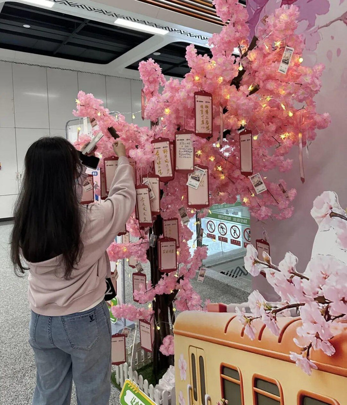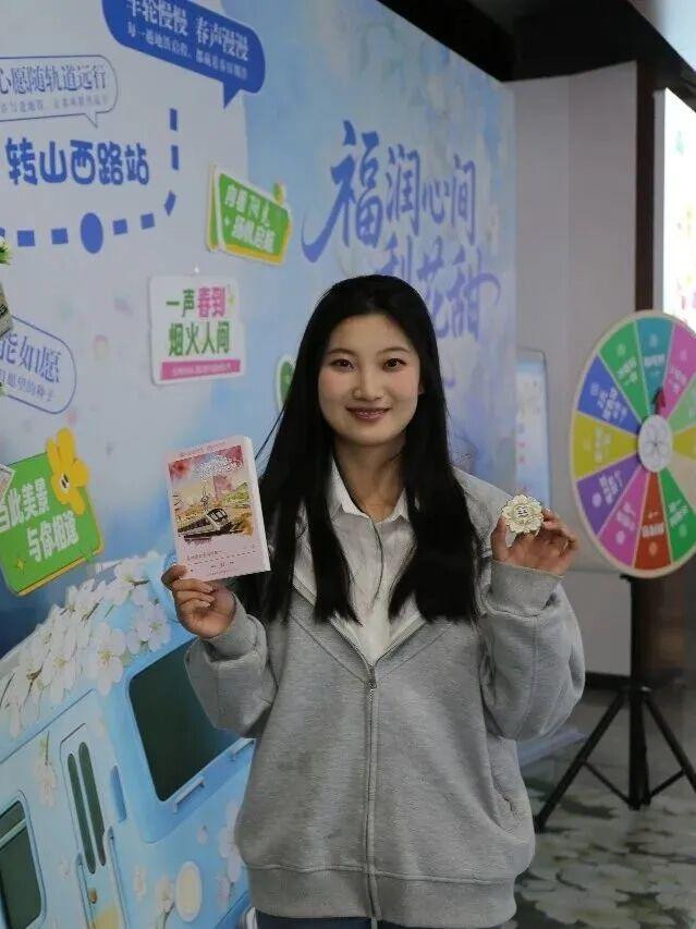 五个站点,五种花语,五重公益心意。五里牌坊站的樱花树上,桃符上写满了“考研上岸”“健康平安”等小小心愿;转山西路站的梨花树前,对诗声此起彼伏,年轻人争相说出“吹面不寒杨柳风”;汉峪金谷站的迎春能量墙上,大家举着桃符写下“我要发光”“向阳而生”;安成街站的海棠市集微景观,随手一拍就是电影感,不少乘客停下脚步;奥体中心站的白玉兰集结台,则是所有集章达人的终点站,领到礼盒的人笑得比春花还灿烂。每个站点不仅有自己的主题花卉,还分别对应了福彩“扶老、助残、救孤、济困”的公益理念和“百千万”青年创业帮扶举措,这些原本严肃的主题,变成了一枚樱花钥匙扣、一枚梨花徽章、一只福气满满的挂件,被参与者们开开心心地带回了家。