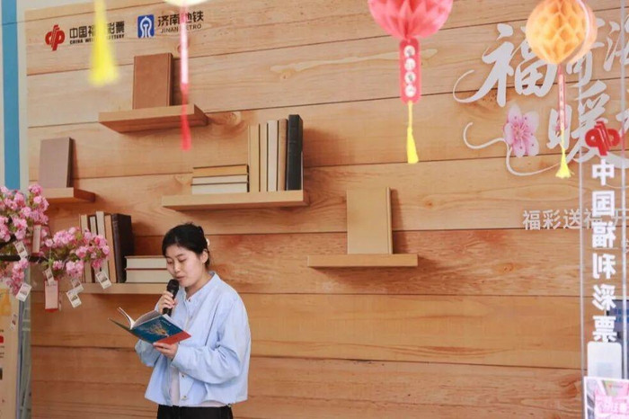 除了每天固定的站点打卡互动,活动期间还特别设置了两场与济南地铁联合开展的沉浸式活动,让春日的车厢和站台充满了艺术与书香。周五,在安成街站,“书香地铁阅见泉城”活动温情上演。工作人员组织“读书分享”环节,邀请乘客聊一聊最近在读的一本书;最受欢迎的当属“你画我猜”游戏,参与者根据书名进行绘画或动作比划,笑声此起彼伏。书香浸润了车站,也点亮了泉城的春日出行。