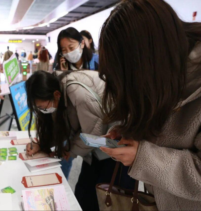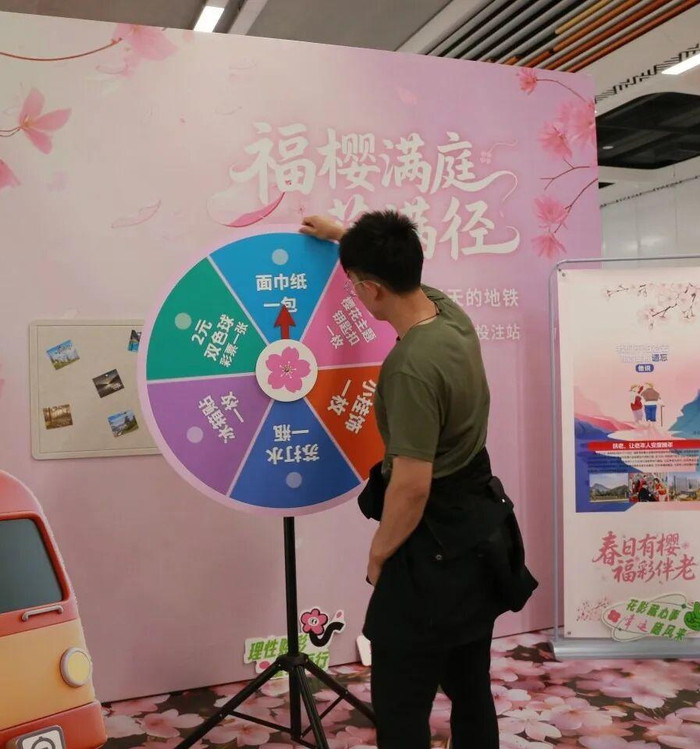 从领取手账到终极礼盒,整套互动流程充满了仪式感。“对诗→挂桃符→转盘抽奖→盖章”这套轻量化玩法,让男女老少都能轻松参与。有人一口气背出十句春日诗,赢得周围一片掌声;有集章爱好者带着自己的集章本专程来打卡;还有不少大学生结伴来了一场“地铁一日游”,集齐五个站点的印章后直奔奥体中心,排队等待那份限定礼盒。定制金属徽章、软萌的福彩玩偶包挂、手绘济南地铁线路图鼠标垫,成了这个春天最抢手的“社交货币”。