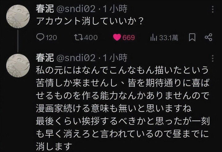 核心意思是:“我已经没办法再画出让大家开心的作品了。继续当漫画家,好像也没有意义。既然大家都希望我消失,那我就消失。”
