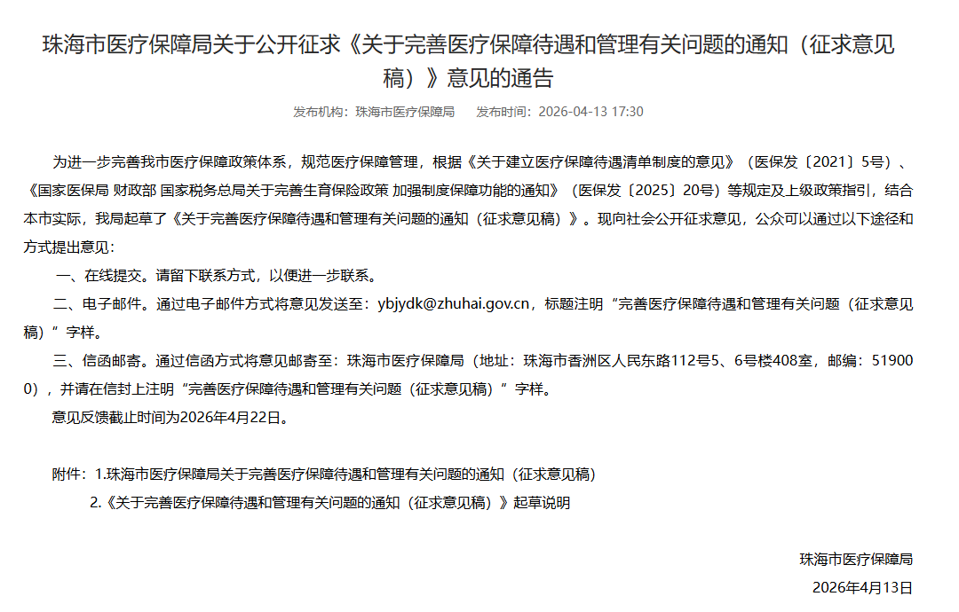 珠海市医疗保障局于近日发布《关于完善医疗保障待遇和管理有关问题的通知(征求意见稿)》(以下简称《征求意见稿》)公开征求意见。意见反馈截止时间为2026年4月22日。