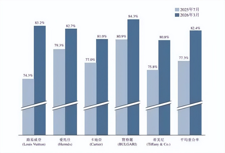值得注意的是,国际奢侈品的消费群体转向老铺黄金的趋势进一步放大。2026年3月,其与路易威登(LV)、爱马仕(Hermès)、卡地亚(Cartier)、宝格丽(Bulgari)、蒂芙尼(Tiffany)等品牌的消费者平均重合率82.4%,较2025年7月的77.3%有所提升。