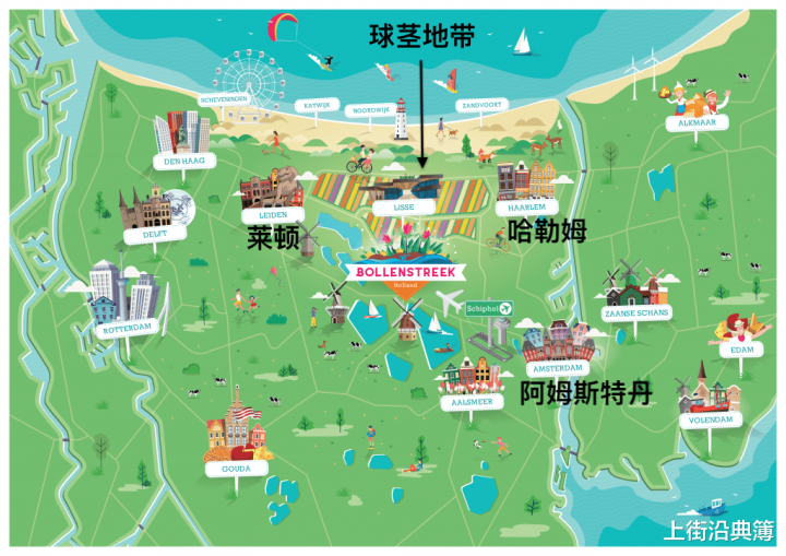 哈勒姆城北有一块叫球茎地带的狭长砂质海岸地区,宽度也就十几公里左右,砂粒粗大、排水比较快,冬季地温还比较稳定。郁金香球茎就怕积水烂根这类情况,这里可是它在全球最理想的生长地方。