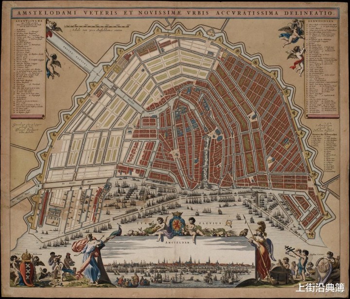 阿姆斯特丹是17世纪全球贸易的中心,城里运河很多,消息传播特别快。1602年,世界第一家股票交易所在这里开张。荷兰人早就习惯用纸面协议交易看不见、摸不着的未来。而郁金香期货,就在这城市中迅速传播。(下图,1662年阿姆斯特丹城市网络图)